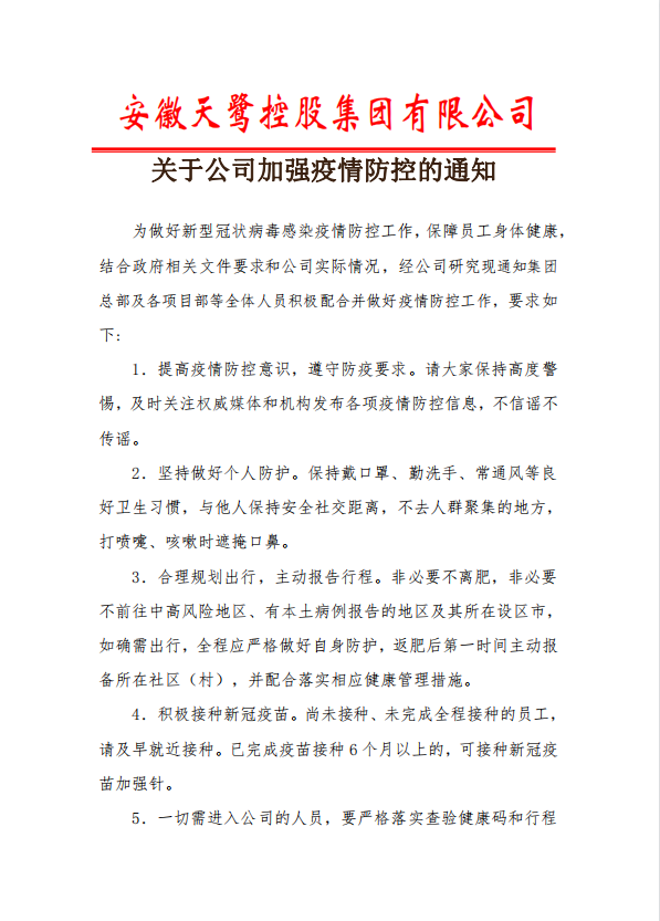 3月21日,長豐縣發現一例新冠病毒無癥狀感染者。疫情就是命令,防控就是責任,在省、市各級領導和上級專家組的指示指導下,長豐縣立即啟動疫情防控應急響應,統籌展開密接排查、流調溯源、采樣檢測、隔離管控、環境消殺等疫情防控處置各項工作,全力以赴打贏這場疫情防控阻擊戰。安徽天鷺控股集團積極響應政府號召,迅速啟動防控工作應急預案,視頻召開會議,全面動員,壓實責任,配合雙鳳社區防疫措施,蒙城北路世紀城一期財富中心所有寫字樓里的工作人員,包括我集團正在總部辦公的數十名員工等幾百人被第一時間隔離,嚴格落實常態化防控措施,堅決筑牢我們家園疫情防控“隔離墻”。