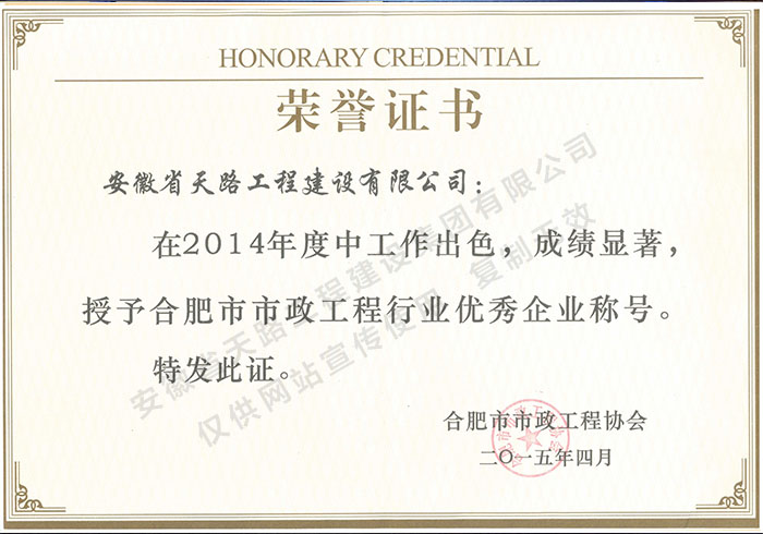 • 2014年合肥市市政工程協會優秀企業證書