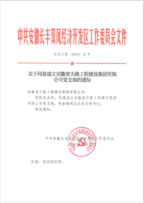 2018年5月2日,安徽長豐雙鳳經(jīng)濟開發(fā)區(qū)工作委員會經(jīng)研究決定,同意安徽省天路工程建設(shè)集團有限公司成立黨支部,并發(fā)布文件通知。