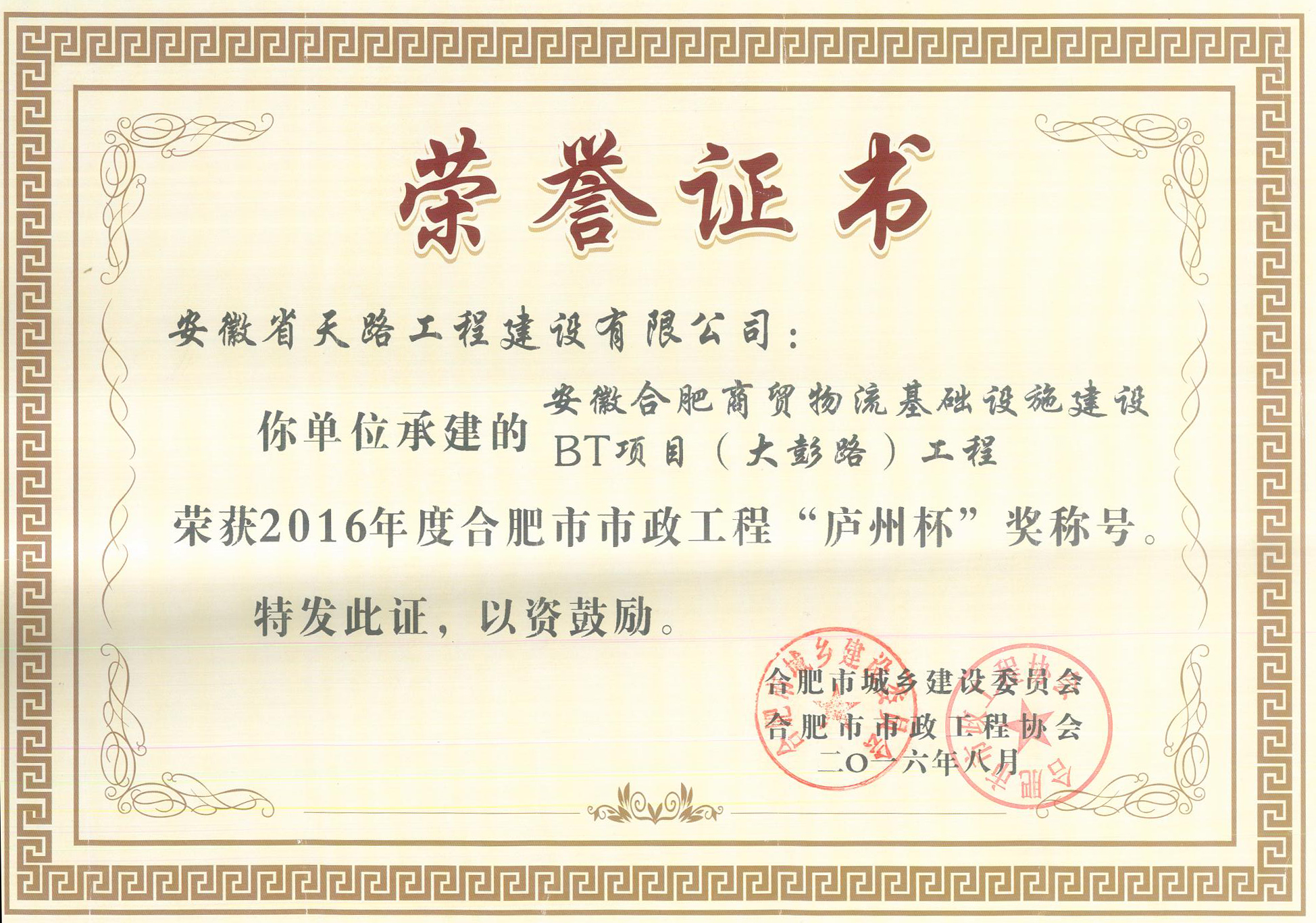 熱烈祝賀安徽省天路工程建設有限公司承建的“安徽合肥商貿物流基礎設施建設BT項目(大彭路)工程”榮獲2016年度合肥市市政工程“廬州杯”獎稱號。